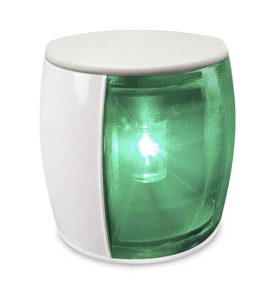 Starboard Light; 3.43 Inch Width x 2-1/4 Inch Depth x 3.54 Inch Height; Less Than 2 Watt Power Consumption; 3 Nautical Miles Visible Distance; 9 To 33 Volt Operating Voltage For 12/24 Volt Applications; IP67 Protection; LED Bulb; Green Lens; Acrylic Lens; White Housing; Plastic Housing; IMO Col Reg 72/ USCG/ ABYC C-5/ RCM/ Maritime NZ Compliance/ CE Certified; With 2.5 Meter Twin Core Marine Cable