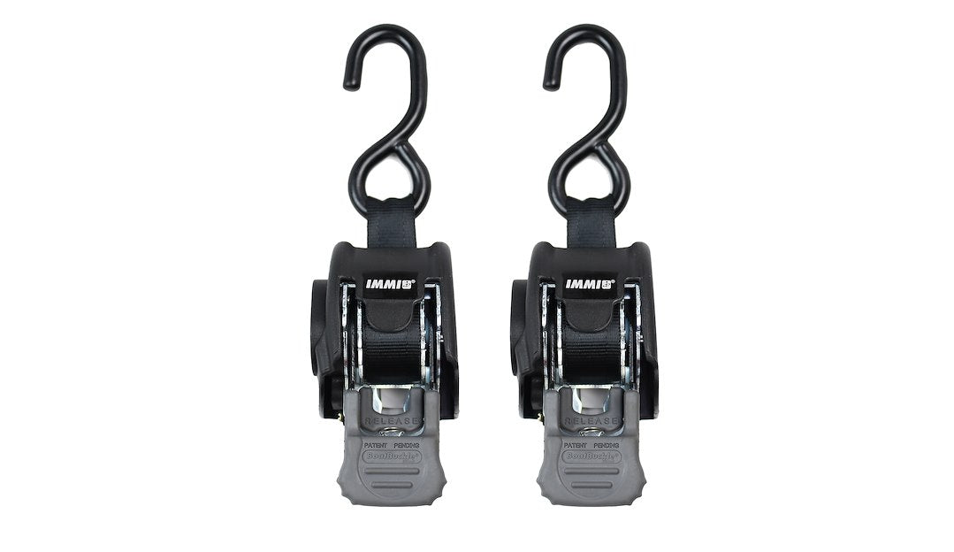 Boat Transom; 6 Foot Length x 1 Inch Width; With Retractable Ratchet; 466 Pound Load Capacity; 1400 Pound Break Strength; Steel Hook On One End And Bolt-On Opposite End; Black; Polyester Webbing And Stainless Steel Housing; Set Of 2