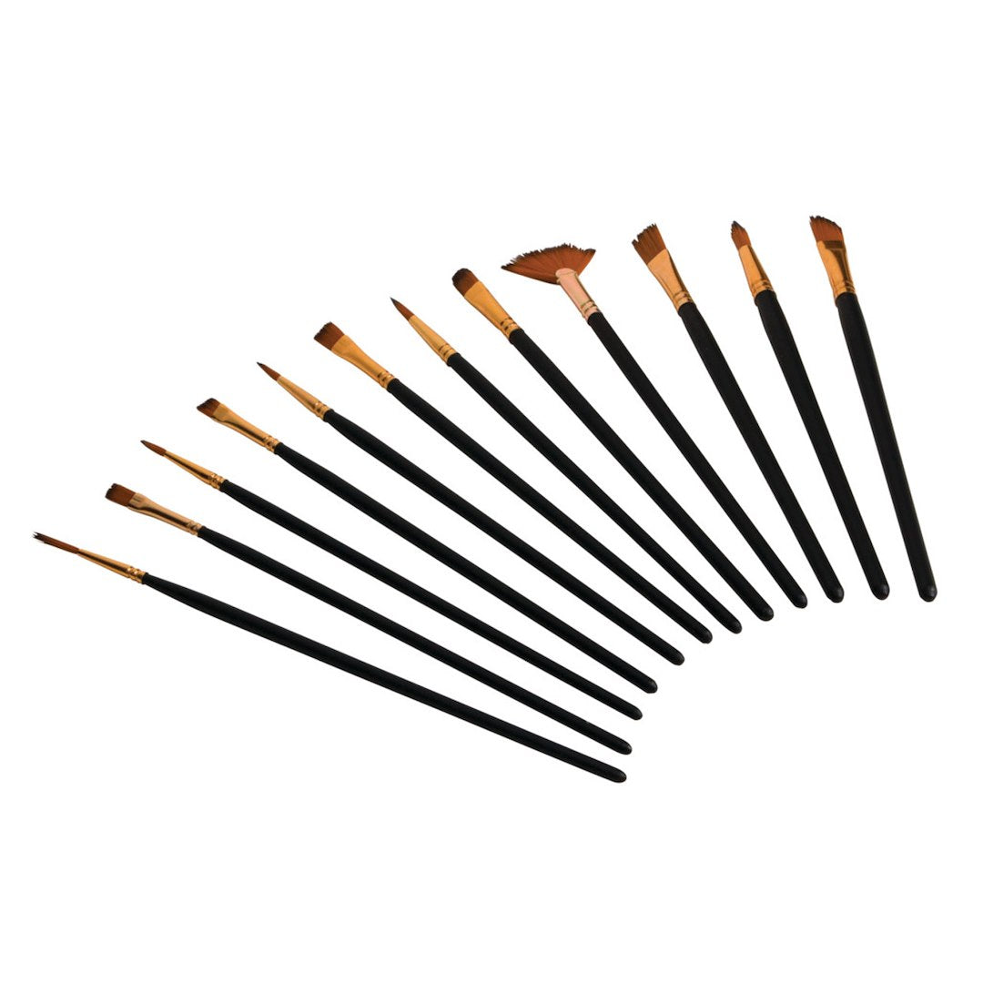 8 Liner/ 3/8 Inch Round/ 3/8 Inch Filbert/ 1/2 Inch Flat/ 3/8 Inch Angle/ 3/8 Inch Saw Tooth/ 4 Angle/ 1/4 Inch Flat/ 6 Round/ 2 Fan/ 4 Liner/ 5/0 Liner; Nylon Bristle; Wood Handle; Set Of 12