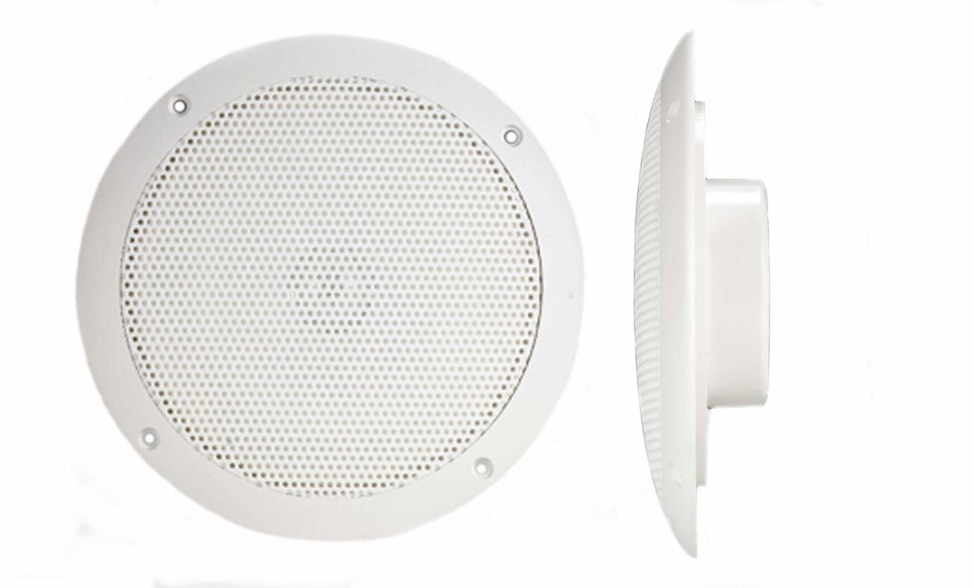 6 Inch Full Range Speaker; 15 Watt RMS/ 30 Watt Maximum; 4 Ohm; Frequency Response: 80 Hertz Through 20 Kilohertz; Ultra-Slim; Mounting Depth: 1 Inch; Overall Diameter: 7 Inch; IP65 Waterproof; UV Resistant; White; Lightweight; REACH/ CE/ RoHS Compliant; Set Of 2